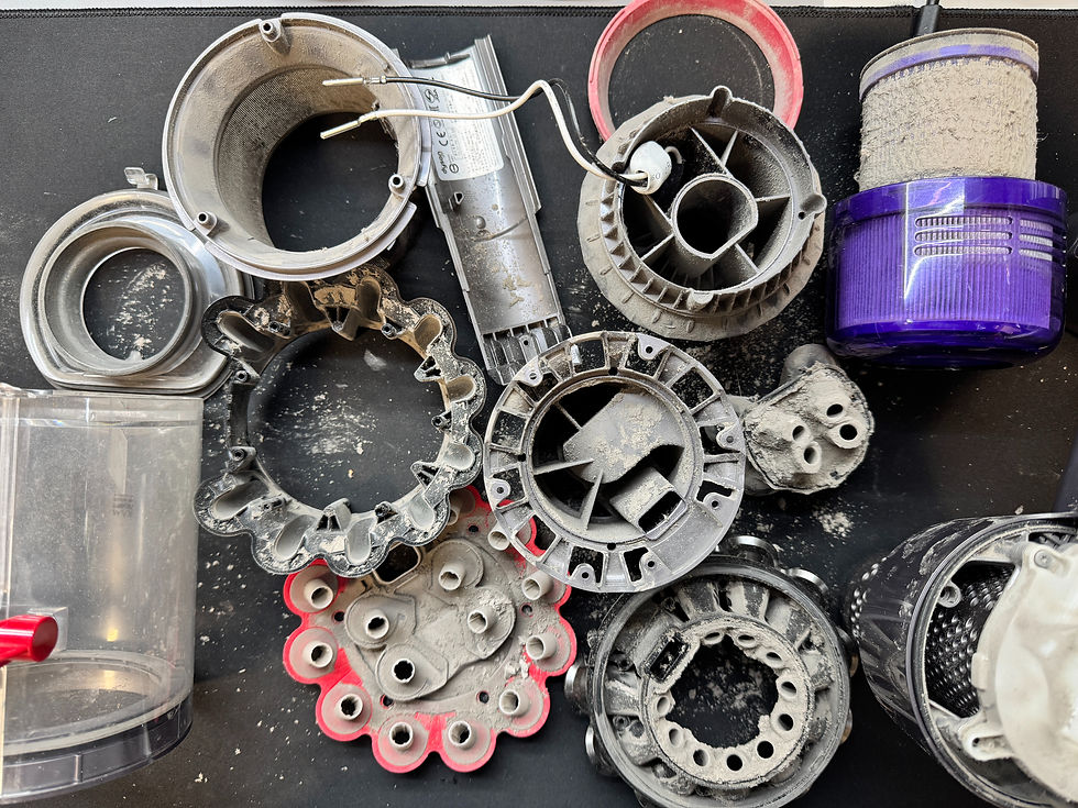 您是否有過這種感覺? 每天努力地吸,桌上、地上、窗溝,甚至空氣清淨機濾芯表面的灰塵,都被集中到了 Dyson 裡。您以為家裡乾淨了,但機器內部卻正承受著無法言語的負荷。 本該經由氣旋管道順暢分離、最後附著在濾芯表布上的細微髒污,因為太久沒有進行深度拆解清潔,或者濾芯早就該換卻沒換,導致這些塵垢開始在每一個氣旋管道壁累積、固化。